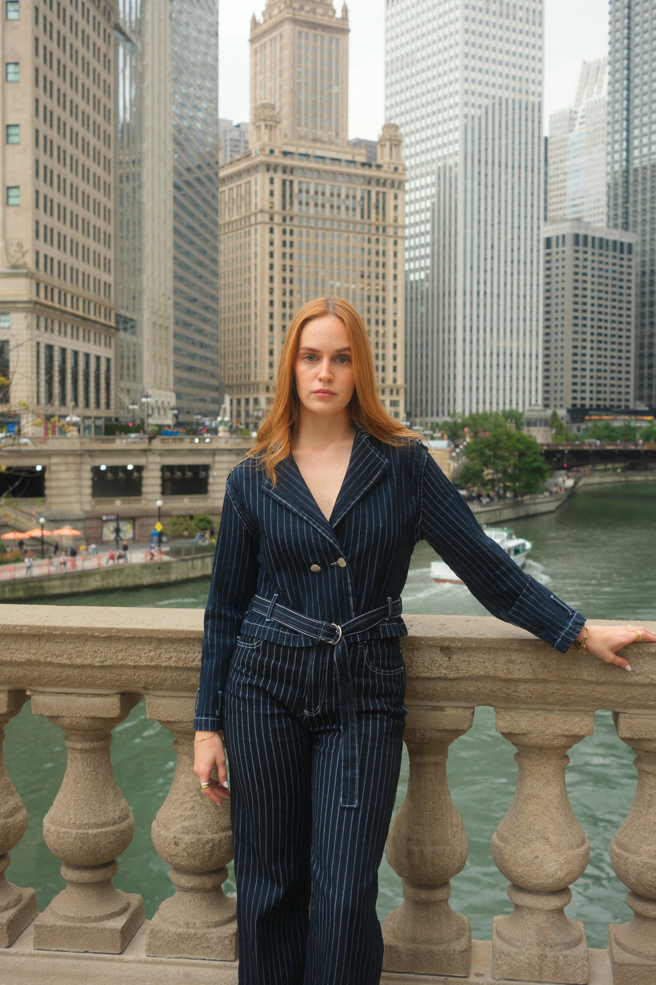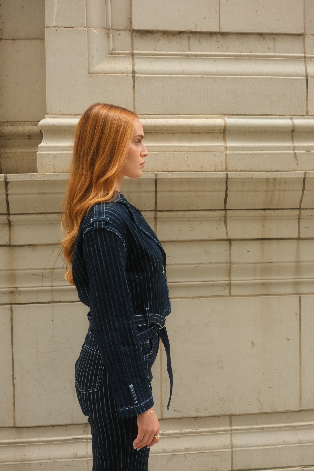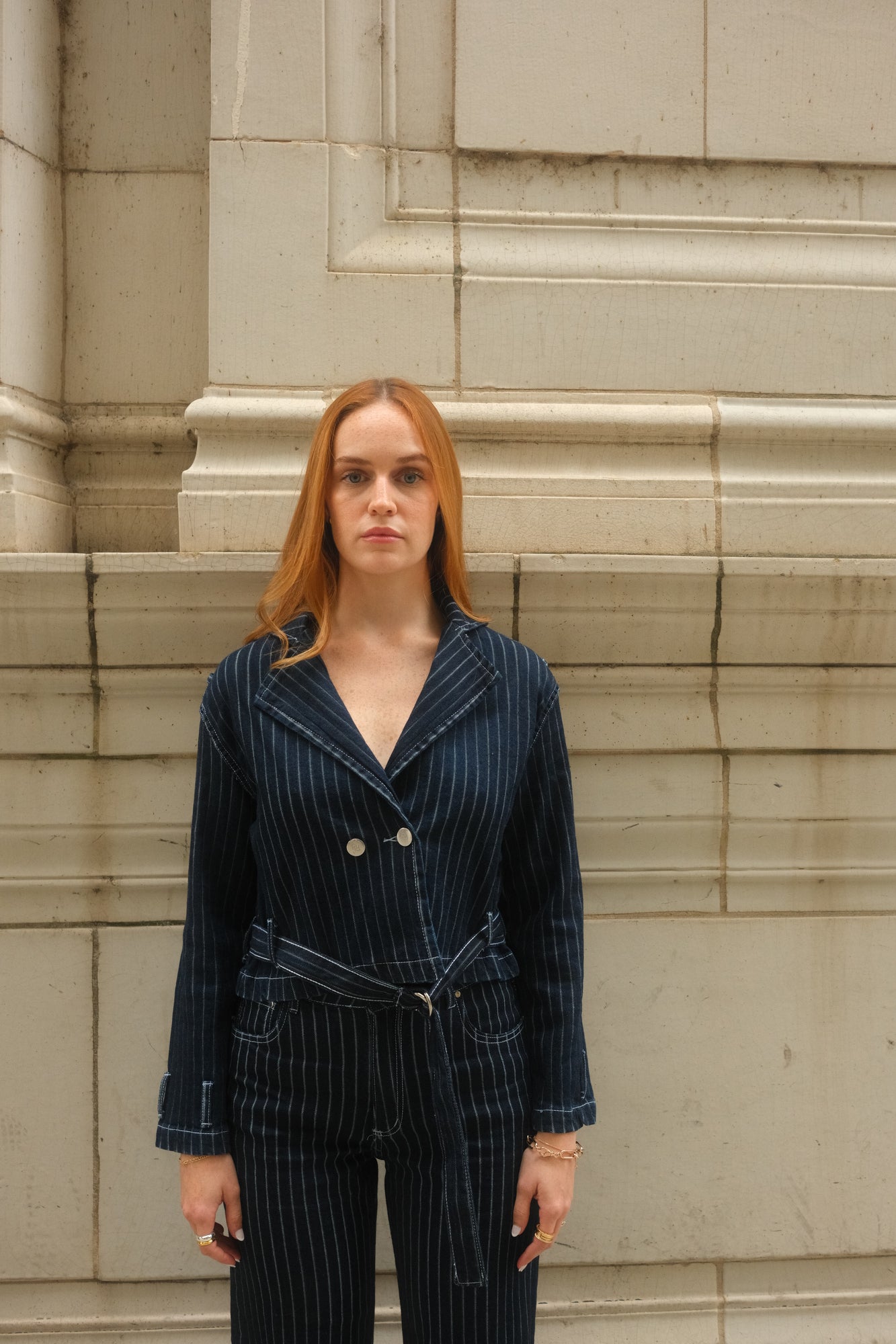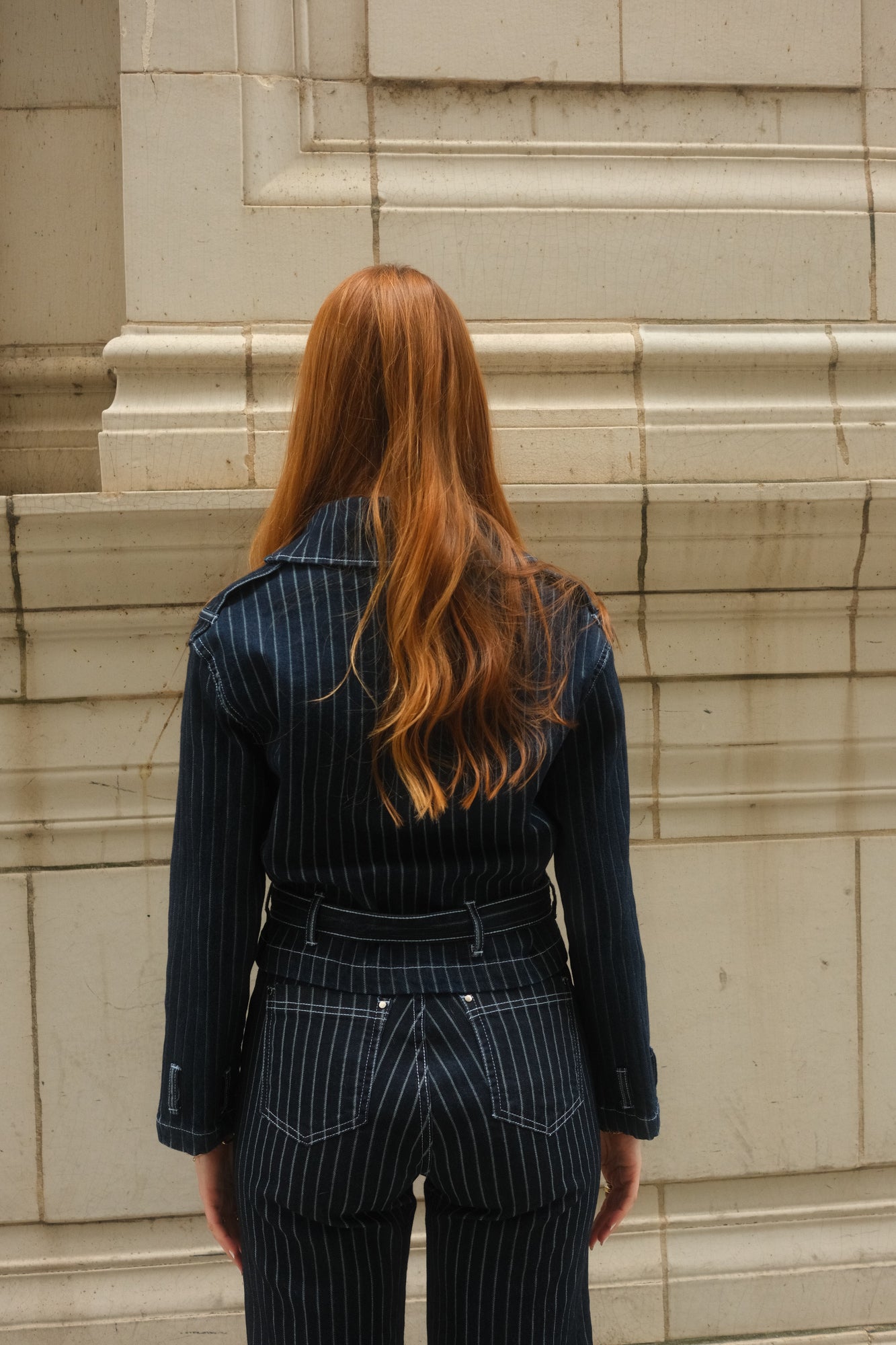 Chaqueta en denim comfort con efecto de rayas en tono índigo.