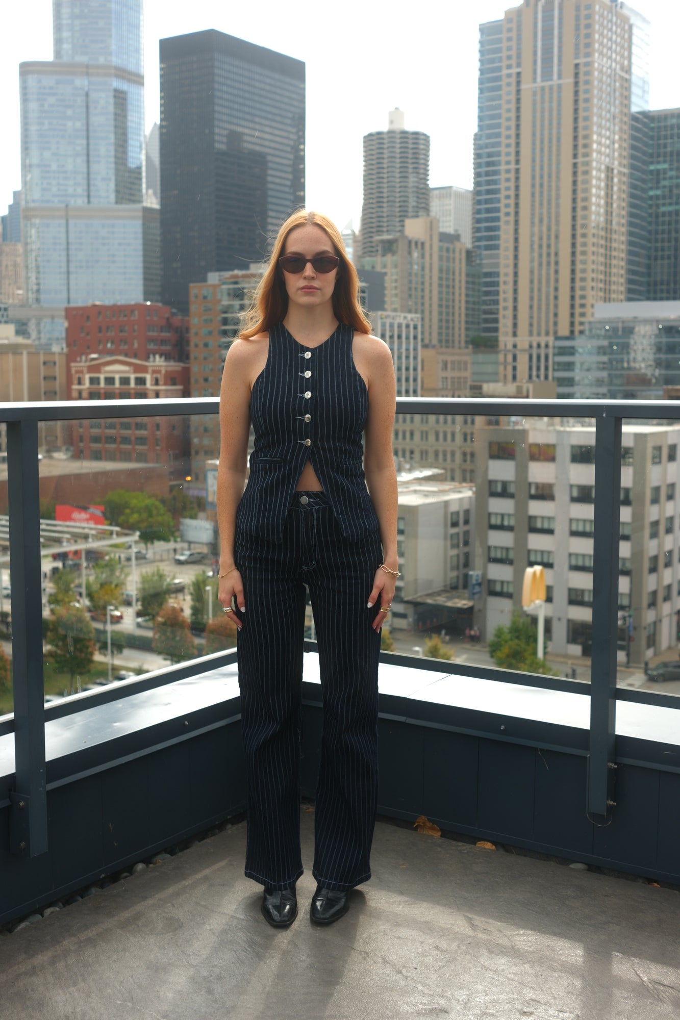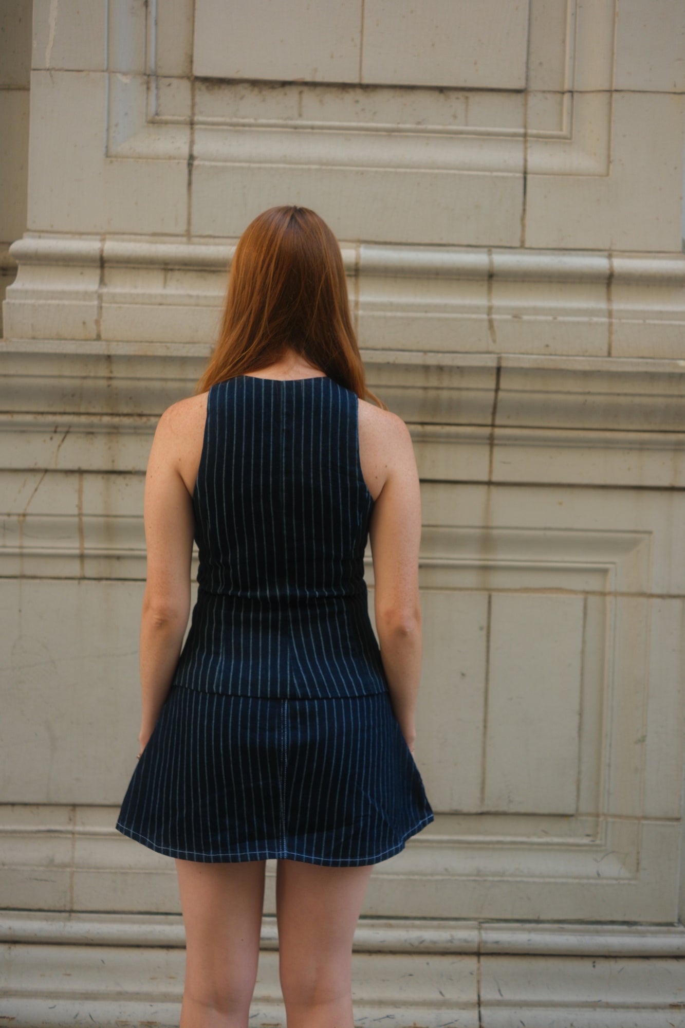 Top tipo vest en denim comfort con efecto de rayas en tono índigo.