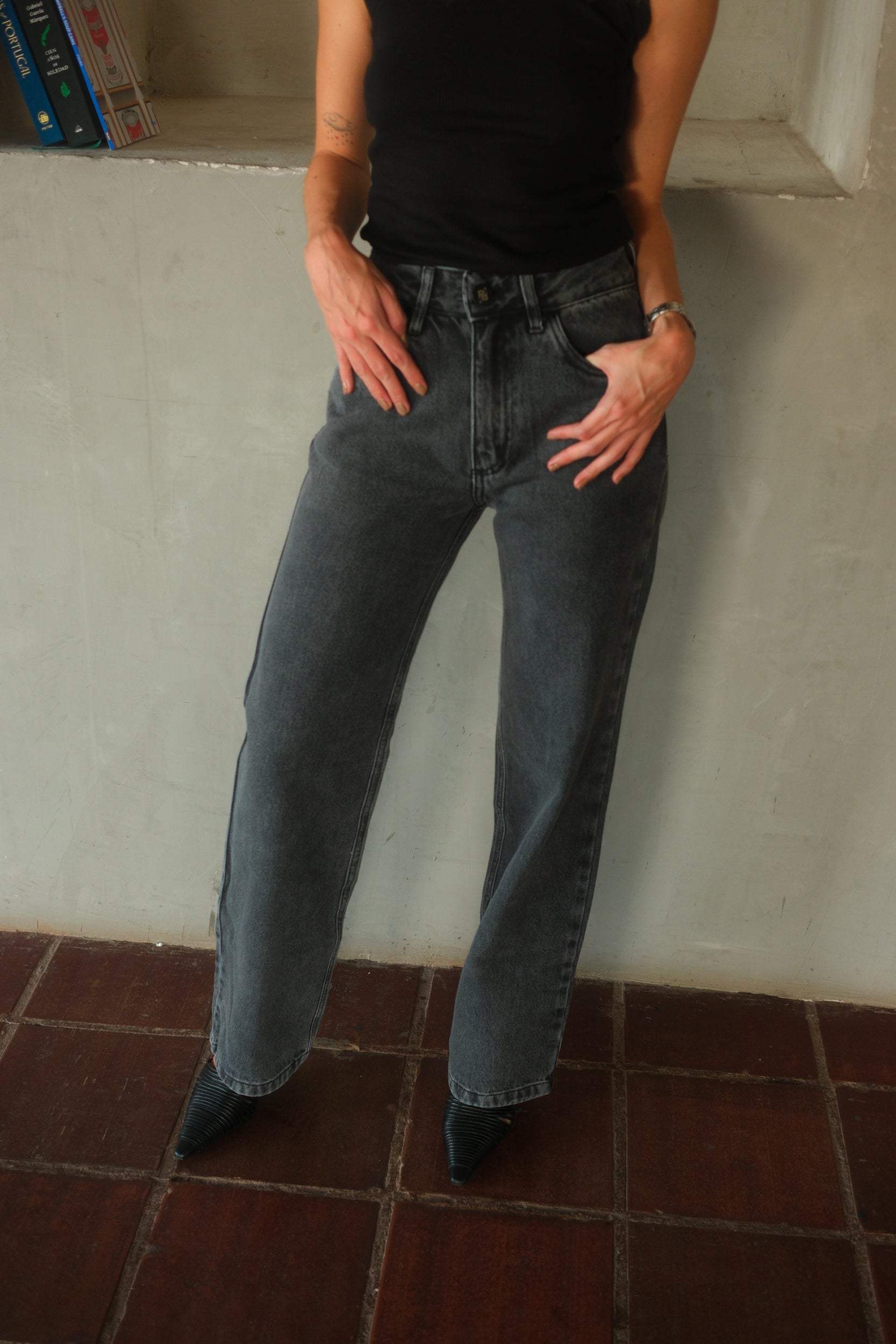 Jeans confeccionados en denim 100% algodón, de tiro medio-alto y corte recto, tono gris artesanal que aporta un aire clásico y contemporáneo.