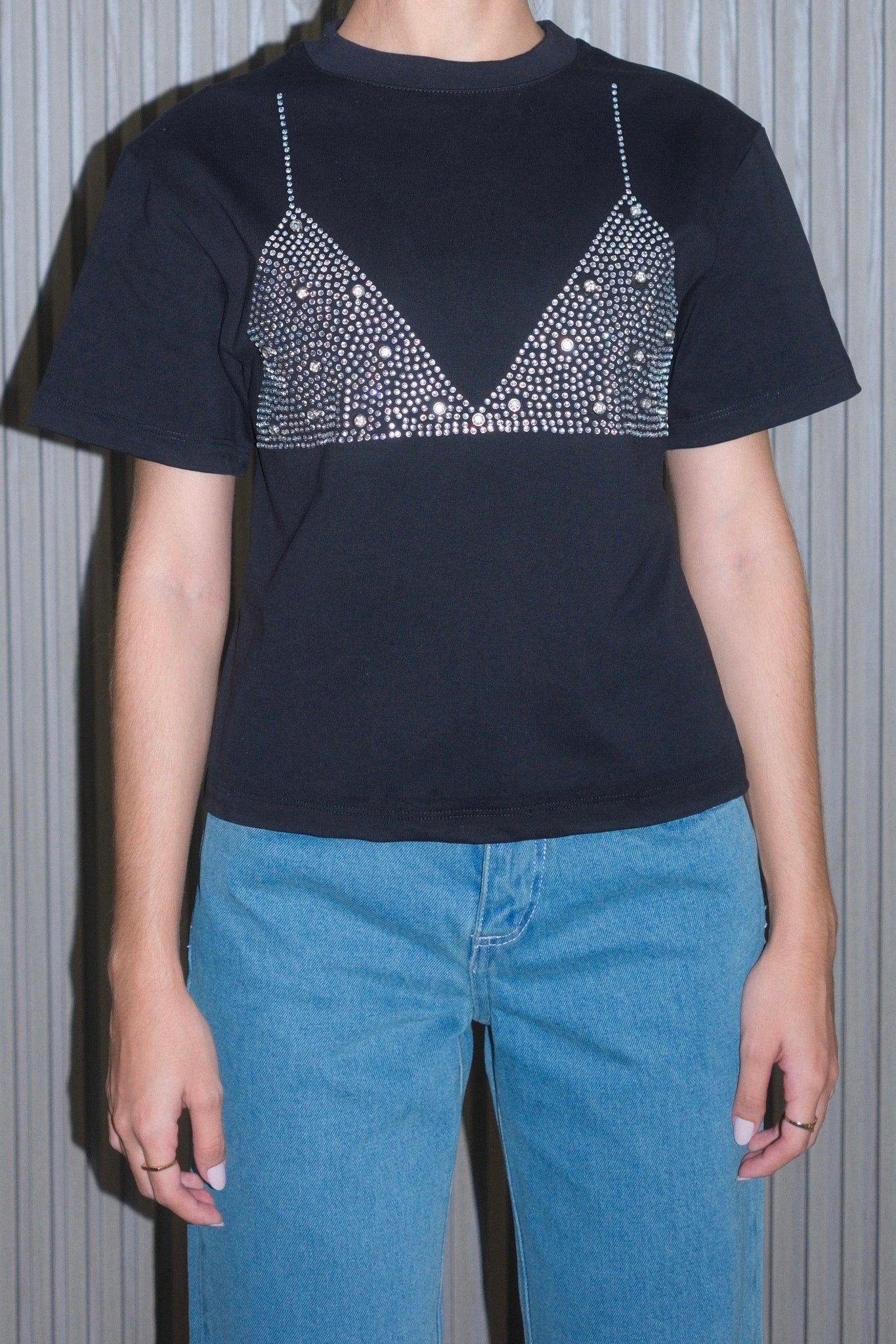 Camiseta con detalle brillantes en forma de brasier, la horma de esta tee es cuello redondo, con cut-out y detalle amarrado en la espalda.