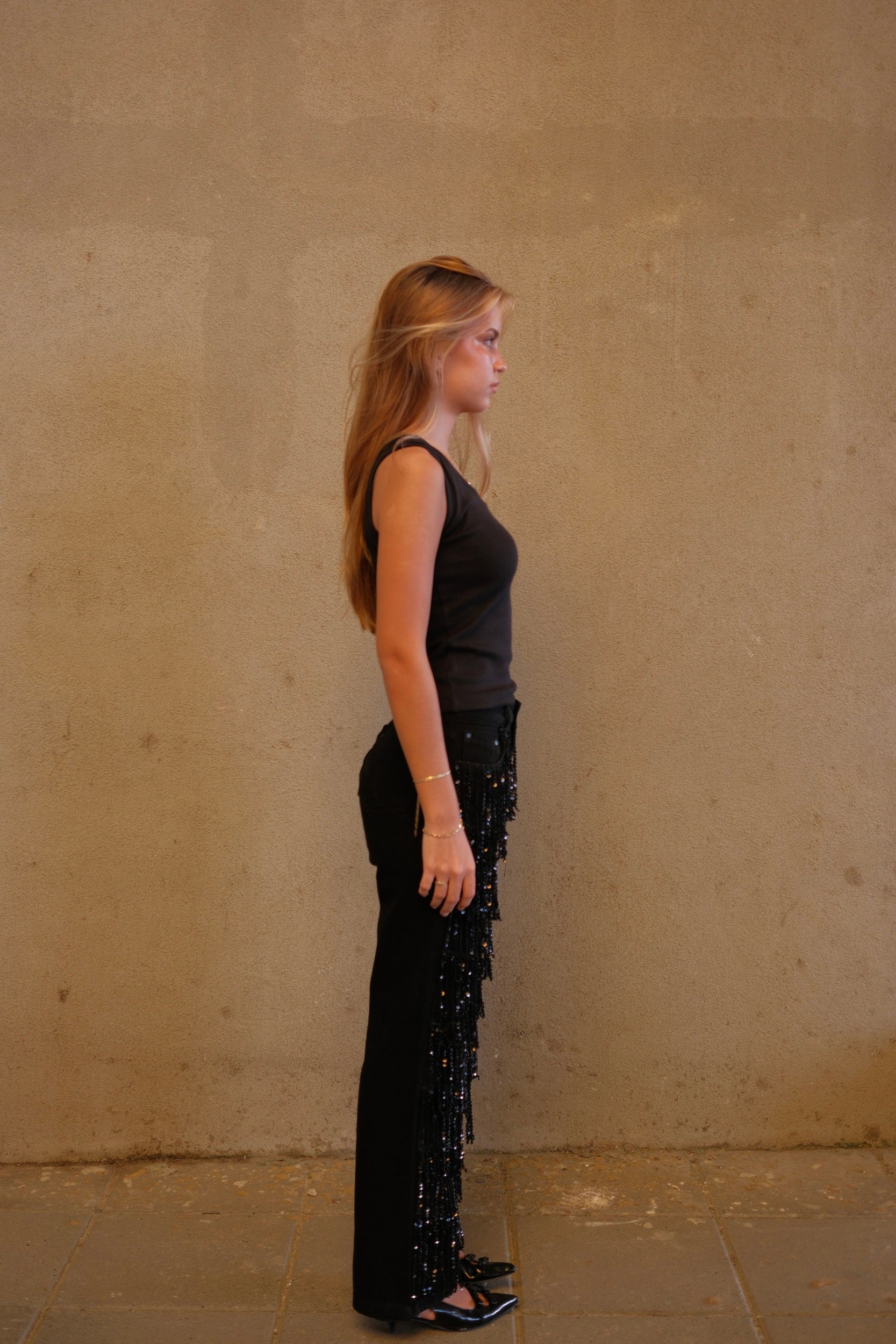 Decorados con flecos de lentejuelas y canutillos bordados a mano, cada detalle refleja el trabajo artesanal que hace de esta pieza algo verdaderamente especial.