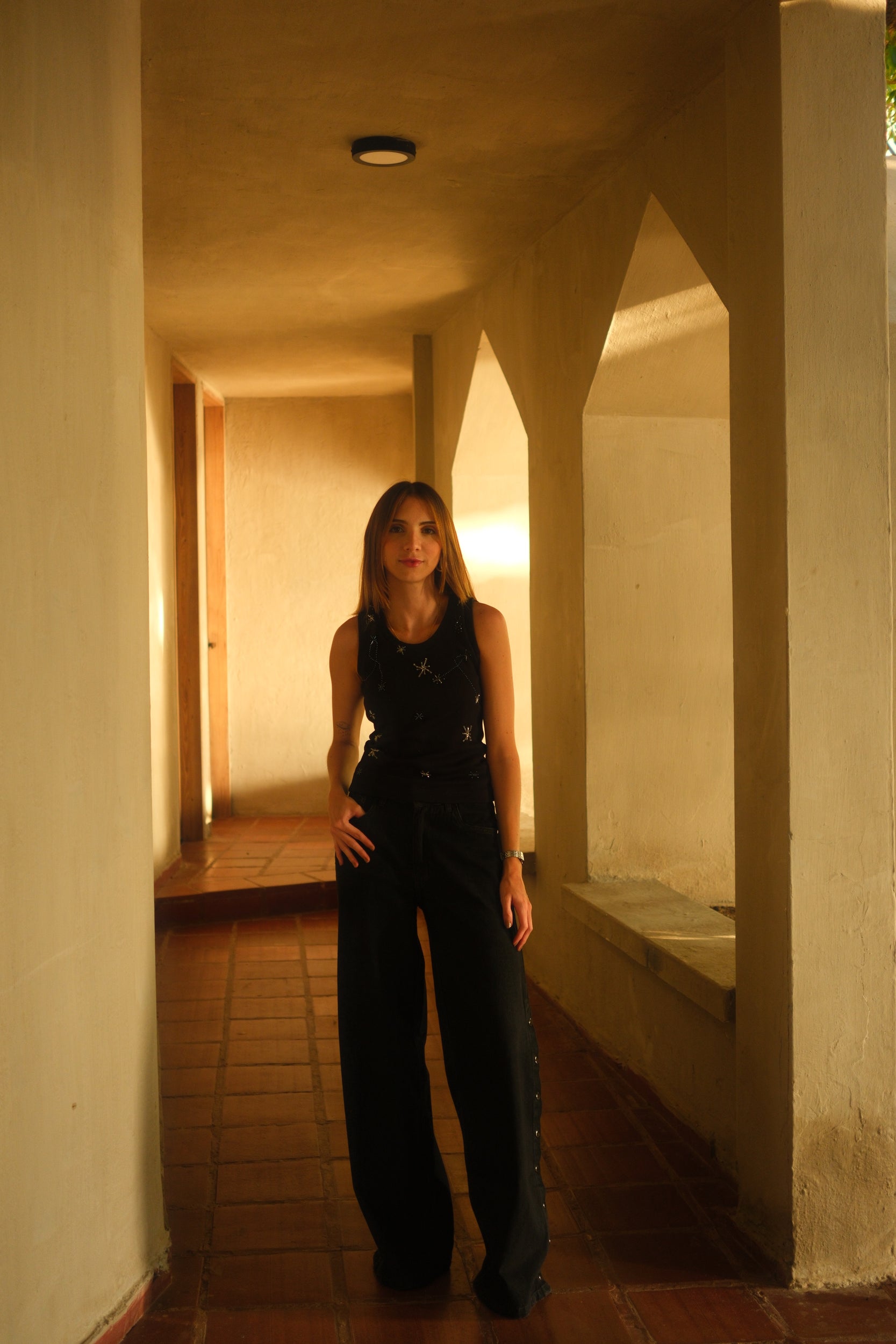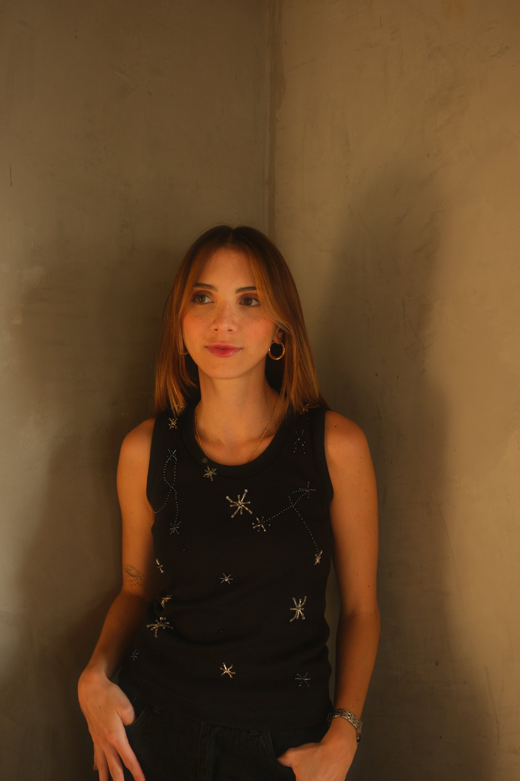 Un tank top muy sofisticado lleno de detalles brillantes bordados completamente a mano.